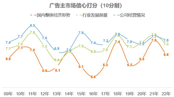 ●《2022中國廣告主營銷趨勢調(diào)查》報告(以下簡稱報告)顯示,2022年受疫情反復(fù)、行業(yè)變革等國內(nèi)外復(fù)雜環(huán)境影響,廣告主的信心指數(shù)(廣告主針對國內(nèi)整體經(jīng)濟形勢、行業(yè)發(fā)展前景、公司經(jīng)營情況的信心打分)相對于2021年有所回落,但仍高于2020年的疫情之初。
