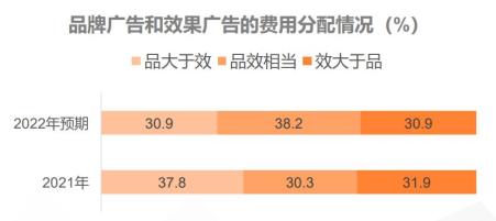 ● 報告顯示,2021年廣告主將52.5%預(yù)算用于品牌廣告、47.5%用于效果廣告。而在2022年,廣告主品效預(yù)算占比的差額進一步收窄,分配預(yù)期更加均衡。
