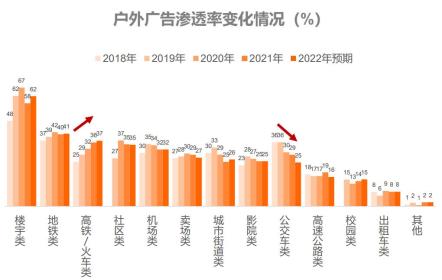 ● 高鐵/火車類戶外廣告連續(xù)增長,2021年滲透率超過社區(qū)類和機場類。而公交車類戶外廣告,則連續(xù)走低。