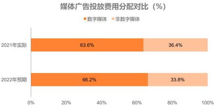 ● 2021年的調(diào)查顯示,數(shù)字媒體獲得了更多的廣告預(yù)算,費用占比為63.6%。到了2022年,數(shù)字媒體的分配占比將再提升近3個百分點。