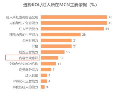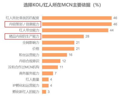 ● 例如,廣告主選擇KOL/紅人所在的MCN的主要依據(jù)是內(nèi)容策劃/創(chuàng)意能力、精品內(nèi)容的生產(chǎn)能力。