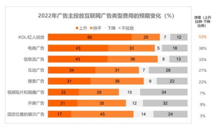 ● 互聯(lián)網(wǎng)廣告類型方面,2022年六成廣告主預(yù)期會增加KOL/紅人的投放費用。紅人擁有粉絲群體,自帶流量,擁有穩(wěn)定的原創(chuàng)內(nèi)容輸出能力,同時,在不同紅人之間可以形成組合投放,在電商大促等大型推廣環(huán)節(jié)可以實現(xiàn)品牌聲量放大。相比之下,視頻貼片和插播廣告、固定位置展示廣告和開屏廣告的投放費用下降率較高,廣告主對純展示類的互聯(lián)網(wǎng)廣告類型興趣下滑。