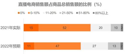 ● 報告顯示,2021年半數(shù)廣告主表示,直播電商渠道的商品銷售額占總銷售額的比例在0-10%的區(qū)間,多數(shù)廣告主預(yù)期2022年會有所上漲。